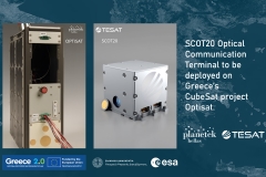 The Optisat mission is among Greece’s first CubeSat projects to demonstrate secure laser-based communications from orbit. In the Optisat mission context, the SCOT20 confirms TESAT's capability to provide high-performance, compact optical communication solutions for micro- and nanosatellites. Using laser light instead of radio frequency (RF) signals, the SCOT20 supports data rates up to 1 Gbps, providing enhanced security against interception or jamming. These capabilities are crucial for missions requiring high speed and secure data transmission. The SCOT20 follows major standards in optical communication such as SDA and ESTOL.