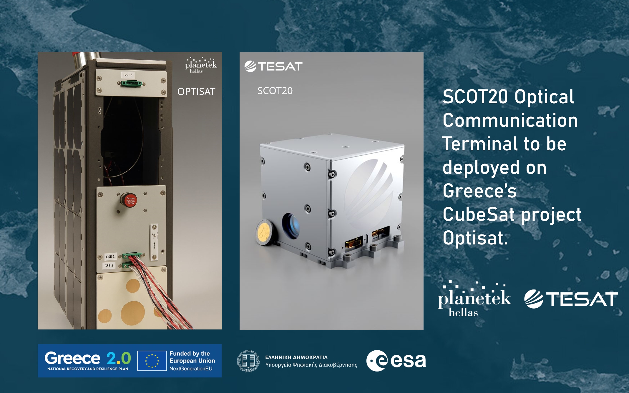 TESAT and Planetek Hellas are pleased to announce the delivery and acceptance of the first SCOT20 Optical Communication Terminal (OCT) flight model. The terminal will be deployed on Optisat, Planetek Hellas’ pioneering mission under Greece’s National Satellite Space Program, supported by the European Space Agency’s (ESA) Directorate of Connectivity and Secure Communications.